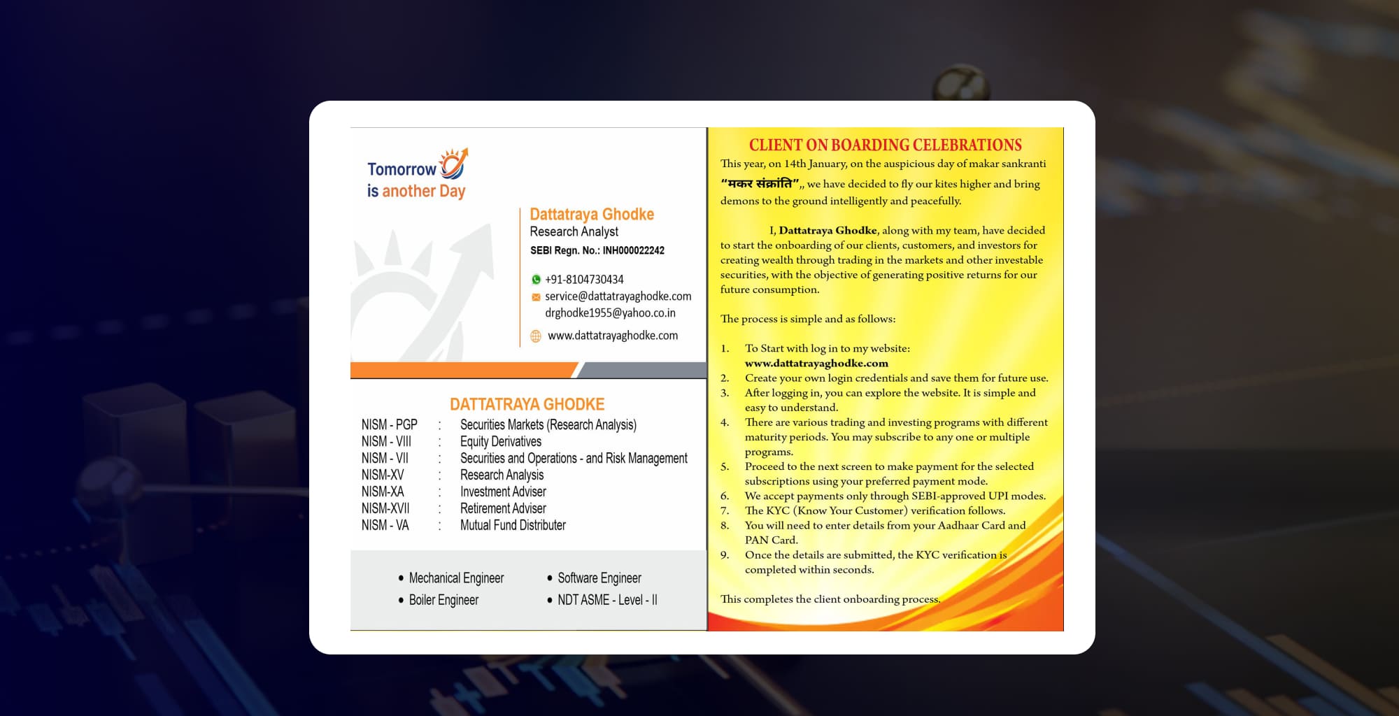 I, Dattatraya Ghodke, along with my team, have decided to start the onboarding of our clients, customers, and investors for creating wealth through trading in the markets and other investable securities, with the objective of generating positive returns for our future consumption.