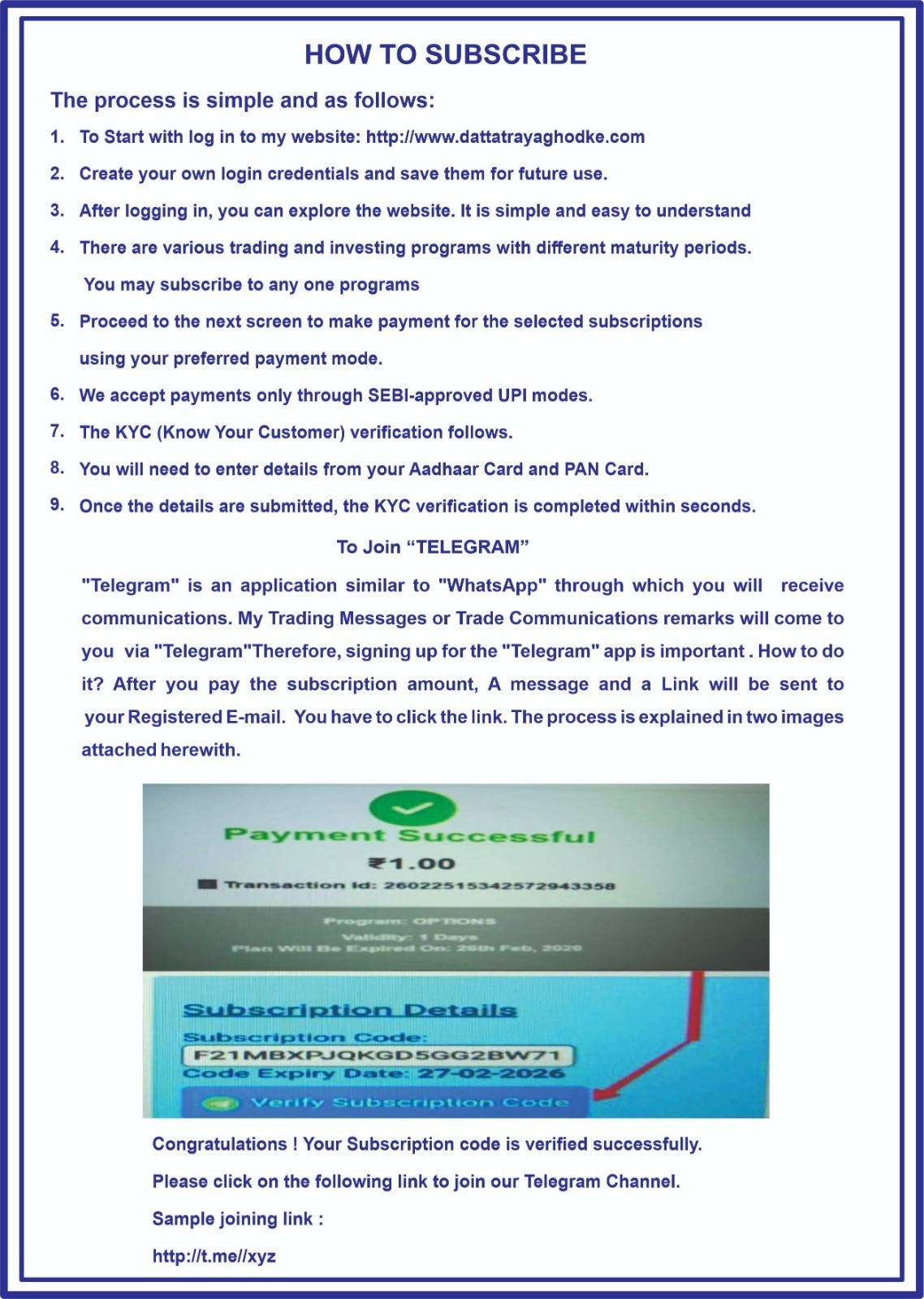 After a successful payment you will get a subscription code and a telegram link. Click on the link to start chat window and put the subscription code.